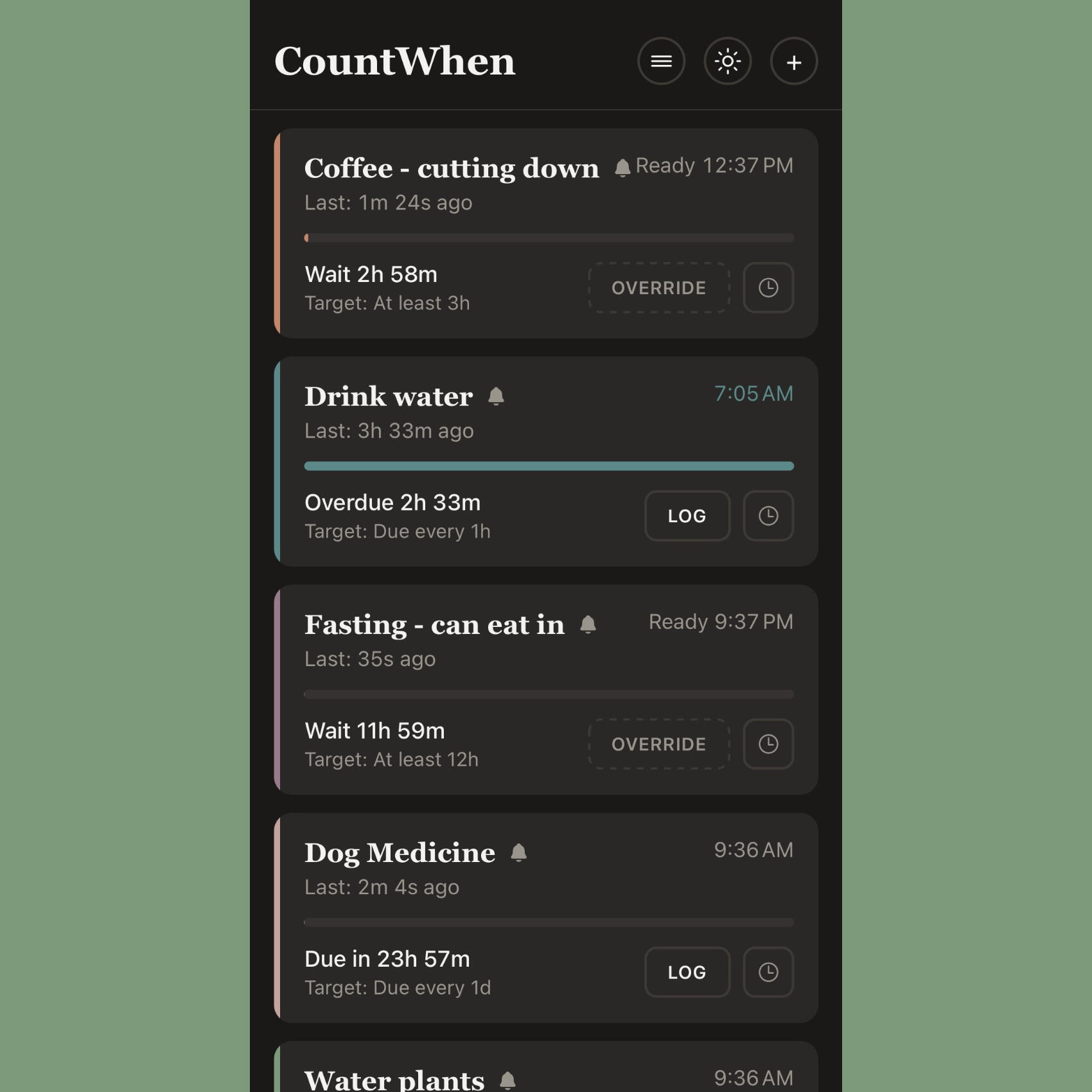CountWhen is a simple interval tracker for daily life. Medication doses, baby feedings, prayer times, dog supplements, watering plants — tap to log, and always know when.